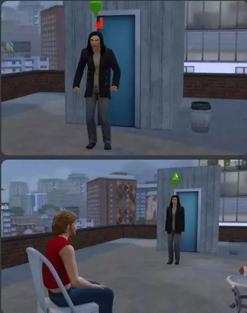 [alt text: two screenshots from the Sims, which appear to recreate an infamous scene from the movie “The Room”. In the first frame, a Sim that looks like Tommy Wiseau is standing in front of a rooftop entryway and looking very angry. In the second panel, the camera has panned out, and “Tommy” is looking calmly at another Sim, who is sitting on a chair on the rooftop. ]