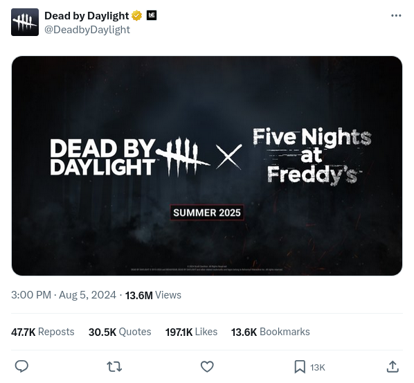 arrow-up14arrow-down1external-linkDead by Daylight x Five Nights at Freddy'stwitter.comnanoUFO@sh.itjust.worksM to Games@sh.itjust.worksEnglish · 2 years agomessage-square2linkfedilinkfile-text