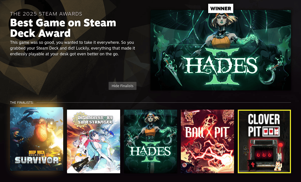 mr_MADAFAKA@lemmy.ml to Steam Hardware@sopuli.xyz · 1 month agoHades II won Best Game on Steam Deck Award - The 2025 Steam Awardsimagemessage-square16linkfedilinkarrow-up1160arrow-down11file-text
