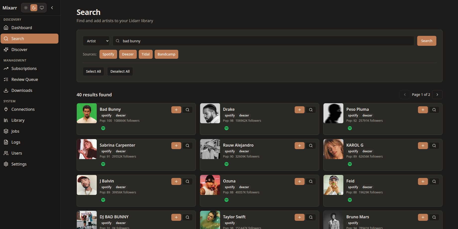 I’m new here! I wanted to share a music search and discovery tool for Lidarr. It plugs into Spotify, TIDAL, Deezer, Last.fm, MusicBrainz, Plex/Tautulli, Jellyfin, and even some AI recommendations.