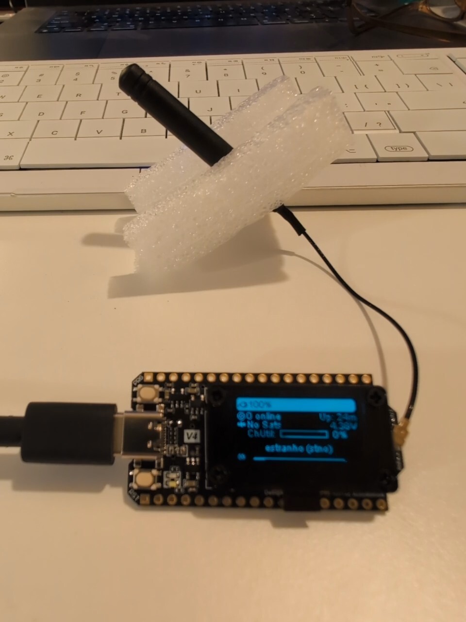 I ordered the radio shown below from a kit on Amazon (it’s a Heltec v4 and came with a battery that isn’t pictured) and it took about 5 minutes to setup. Attaching the antenna to the board was the hardest part.