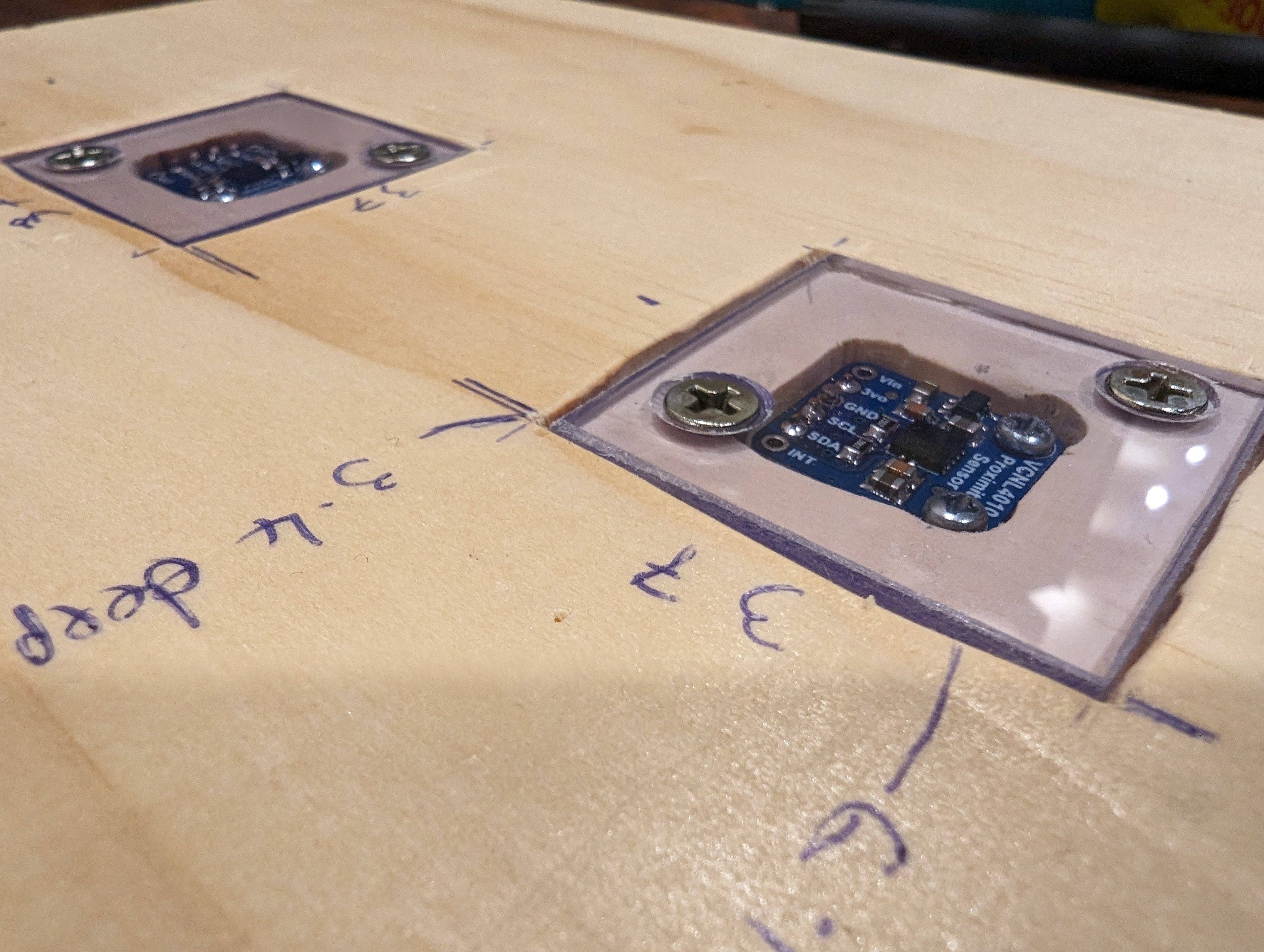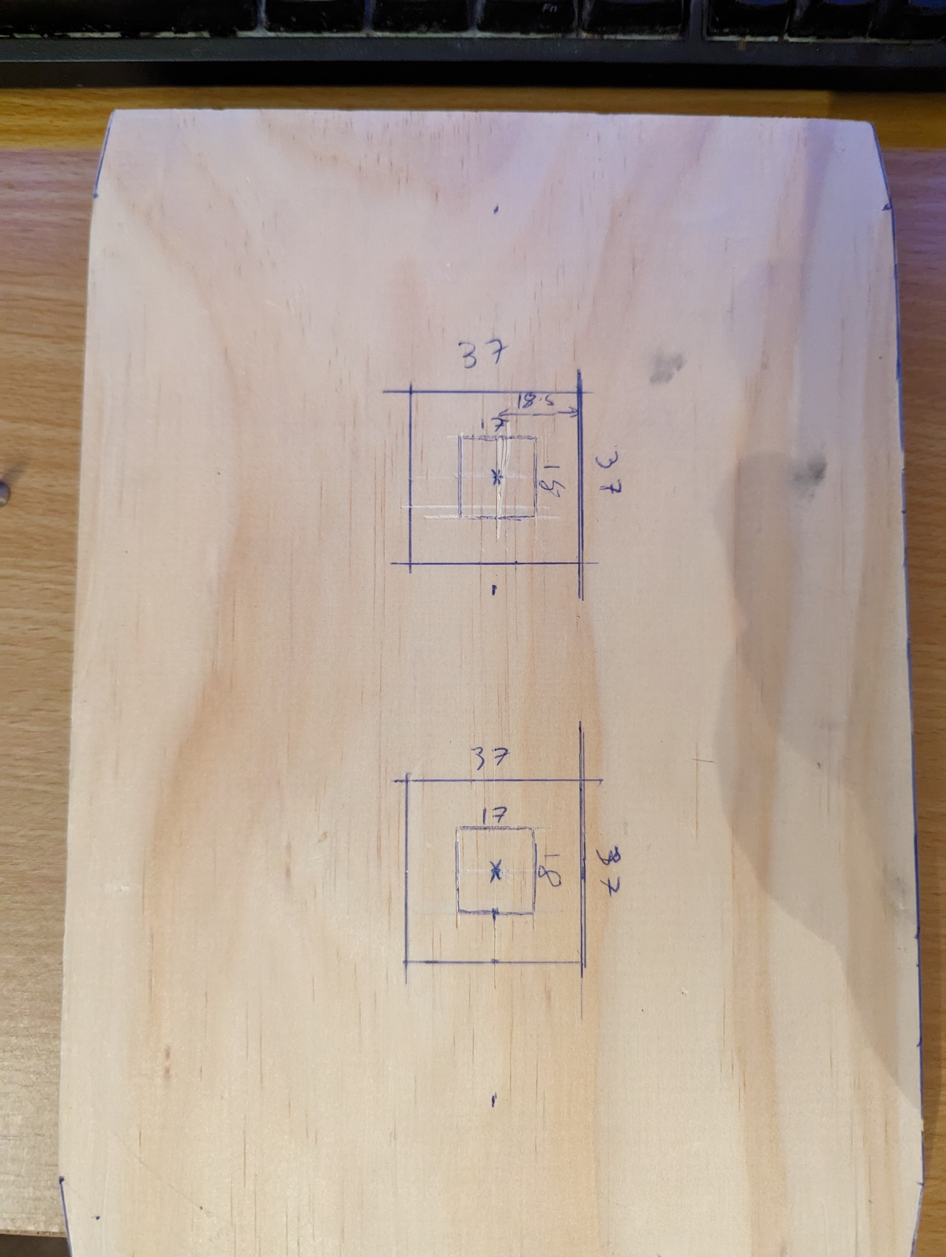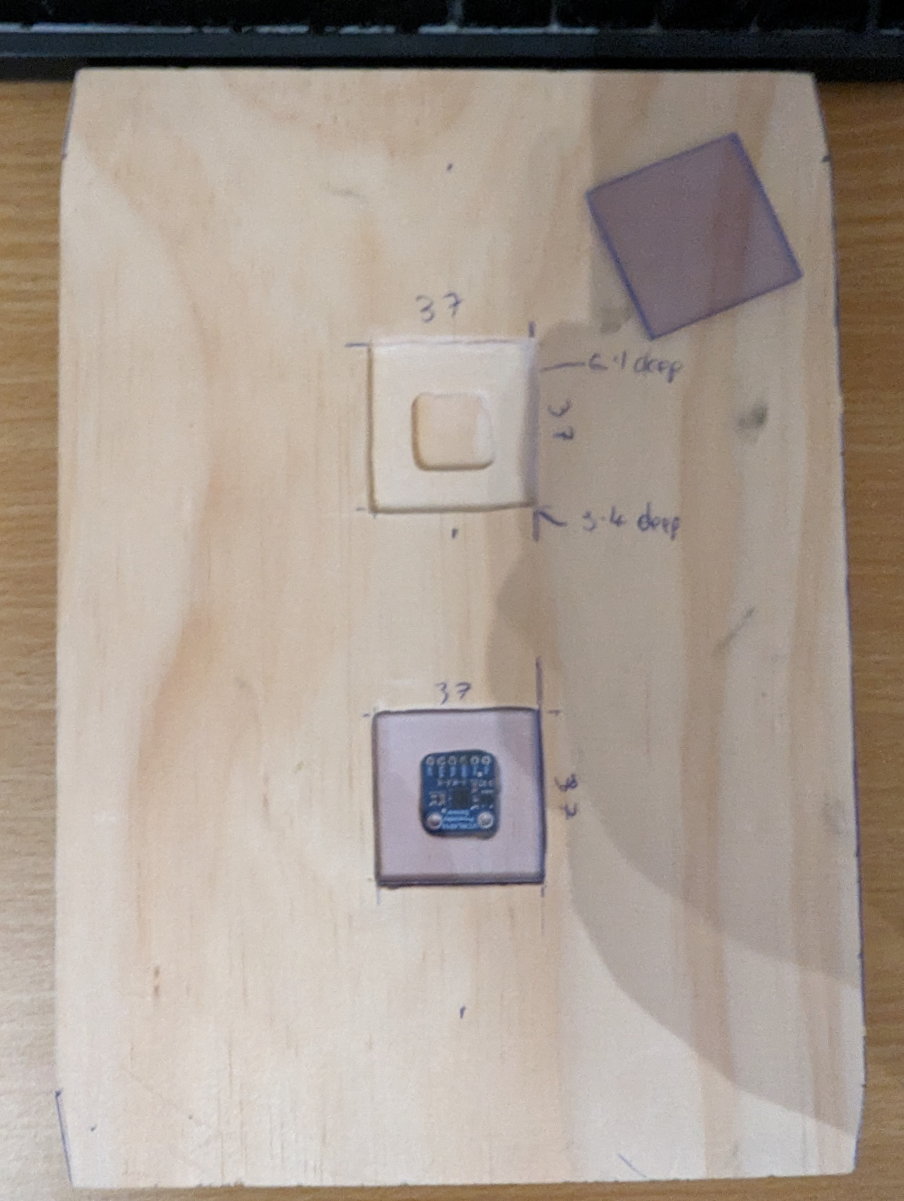 Measured out where the sensors should go, along with a surrounding space to screw down some little perspex windows to cover them. The idea I wanted was for the mail to be able to slide over the sensors without getting caught on them, as well as to protect them from dust.