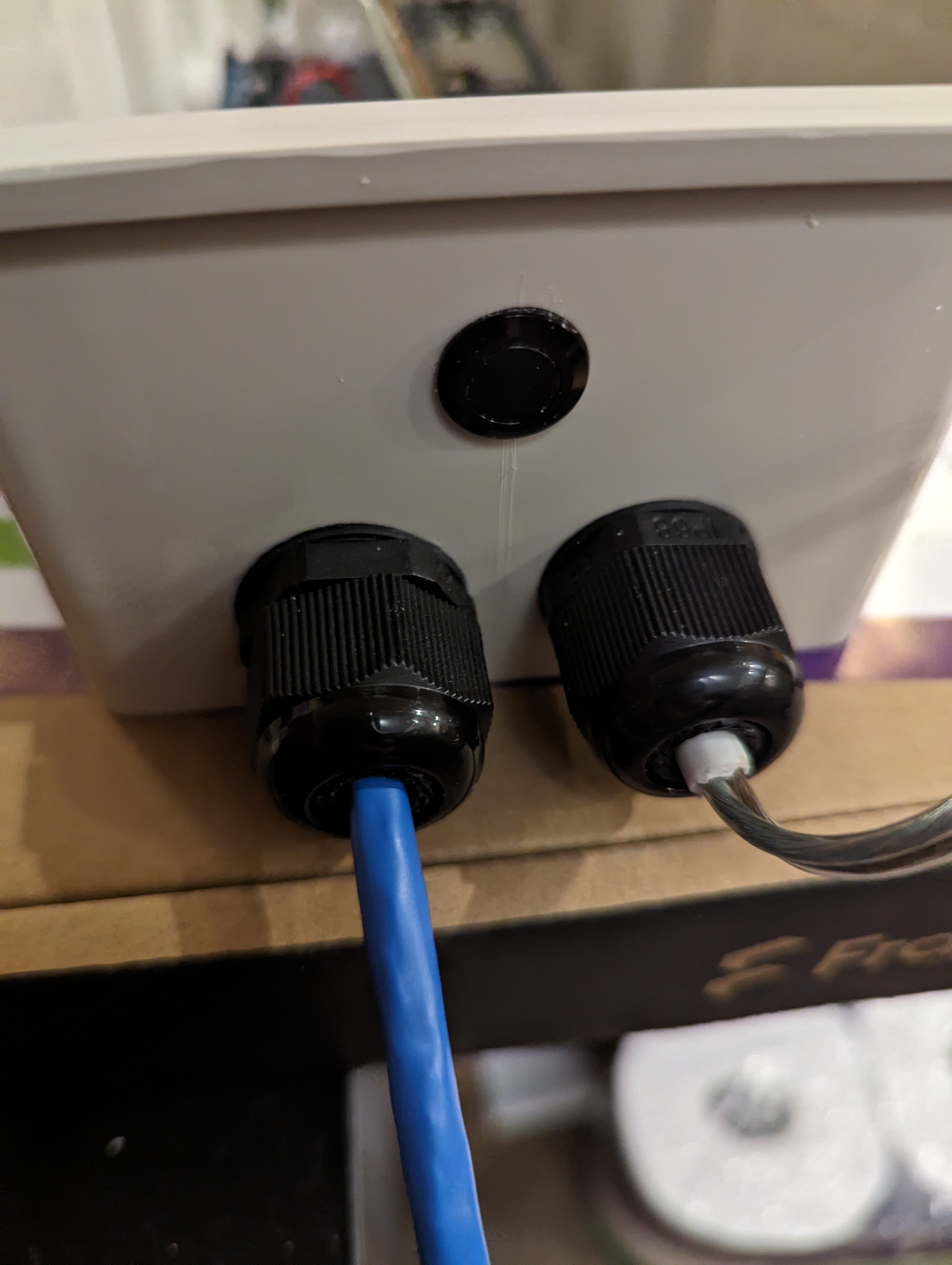 I drilled holes in the weatherproof box to fix the cable glands and the weatherproof button. In the case of the solar panel wire, I had opted to buy speaker wire since I figured it would be easier to run in the channel between the two solar panels, being flat. But that also made it not really fit the cable glands that great. I ended up stripping some of the outer sheath off some 2 wire power cable I had, and wrapping that around the part of the speaker wire that gets clamped in the glands, just to make a reasonable seal. These all were on the side I decided I would mount at the bottom, so water wouldn’t be able to easily fall into the box.