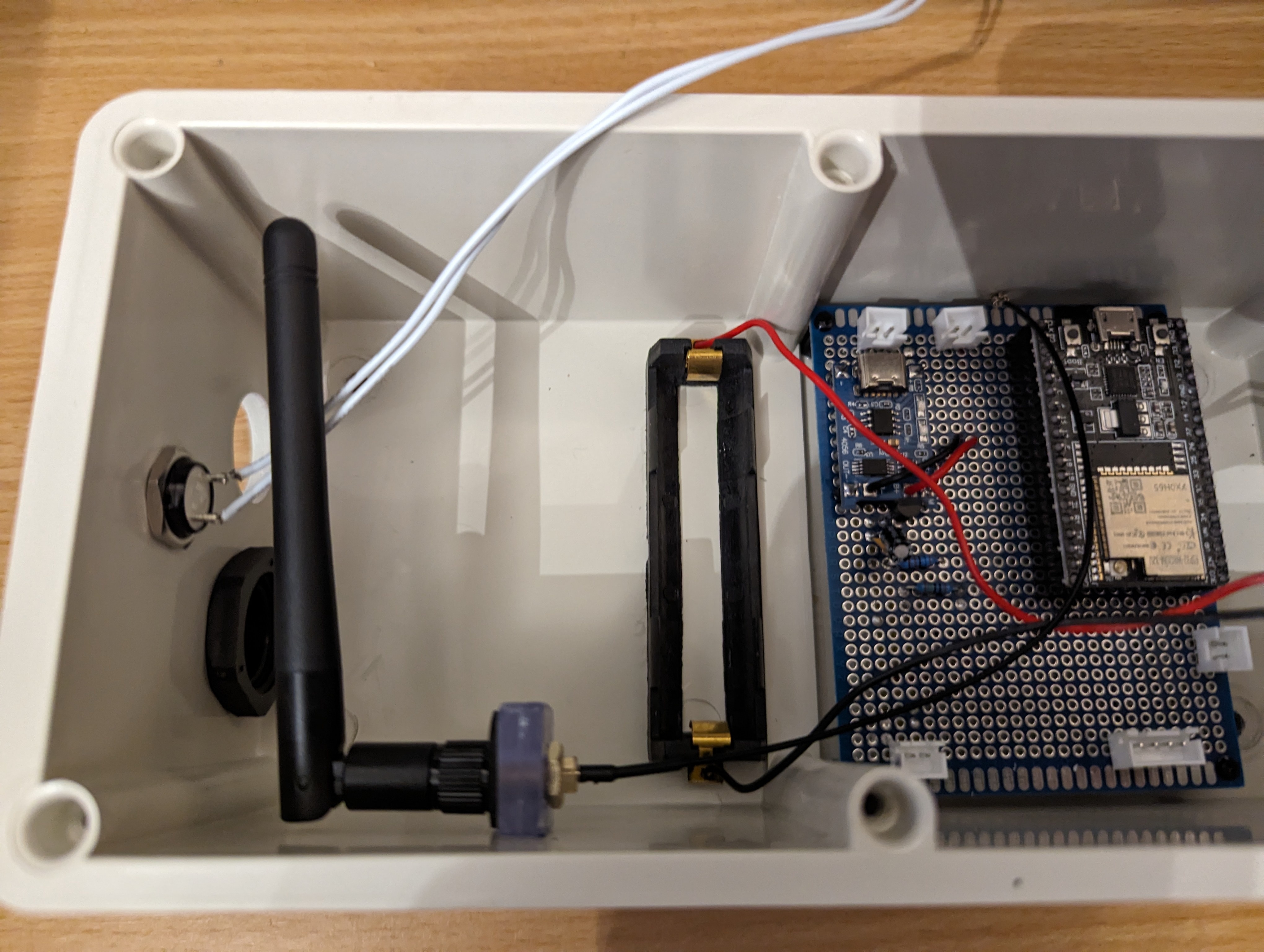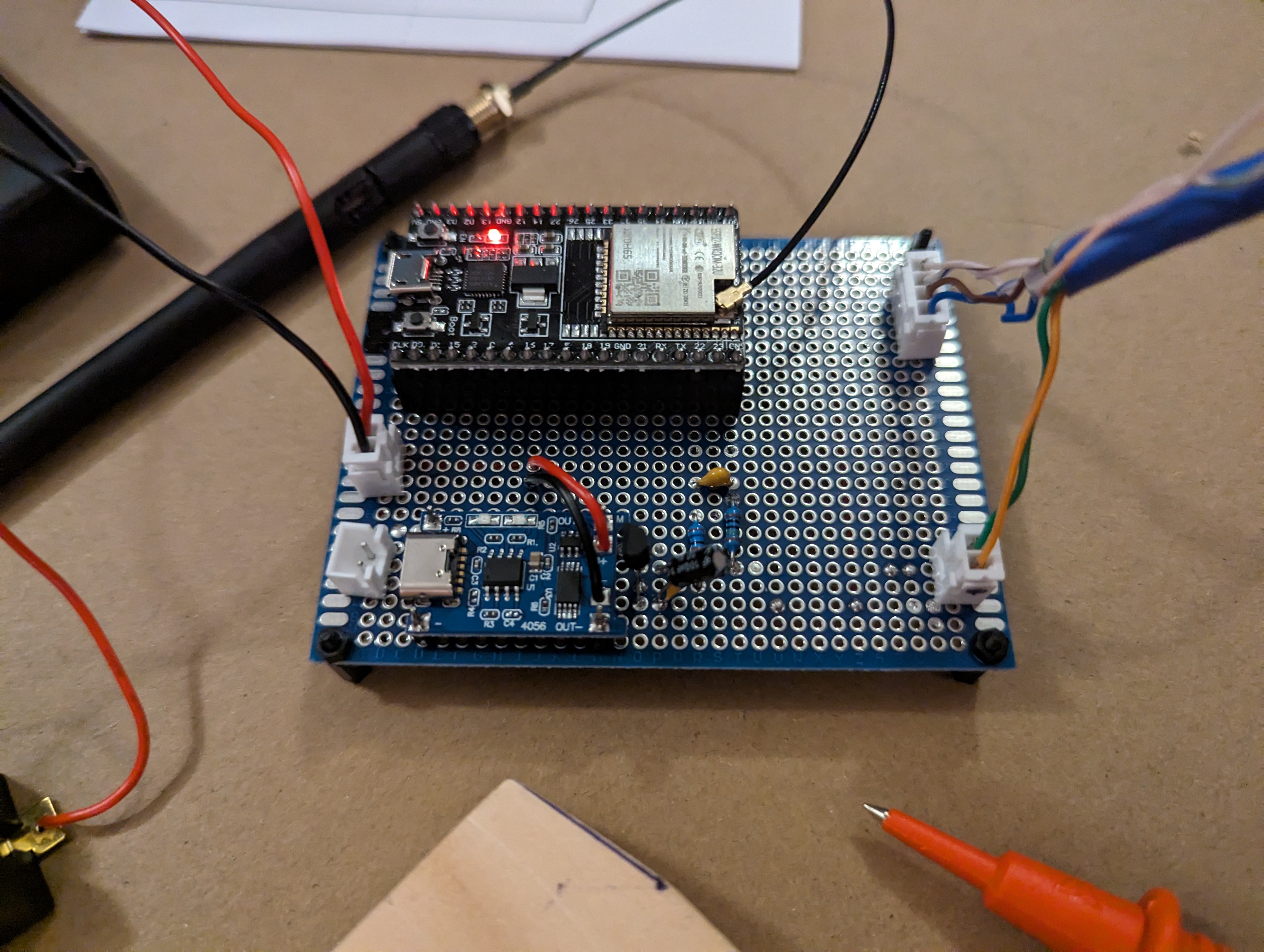 Wiring up the prototype board was next. Again, see the article I linked above for how this works. I used pin headers to allow the ESP32 dev board to be slotted in and out, just in case I ever needed to take it out for replacement or reprogramming. Also the JSTs on the prototype board are for connecting the battery (top left), connecting the solar panels (bottom left), providing power to the sensors (bottom right) and clock and data lines for the sensors (top right). Since the sensors are both using the same I2C bus address and cannot be configured otherwise, I had to run two clock and data lines, but if I’d found sensors that could have different addresses I could have just used one of each. I didn’t take a photo of the board at this stage, but I later added another header to connect a button to reset the ESP32 from the outside.