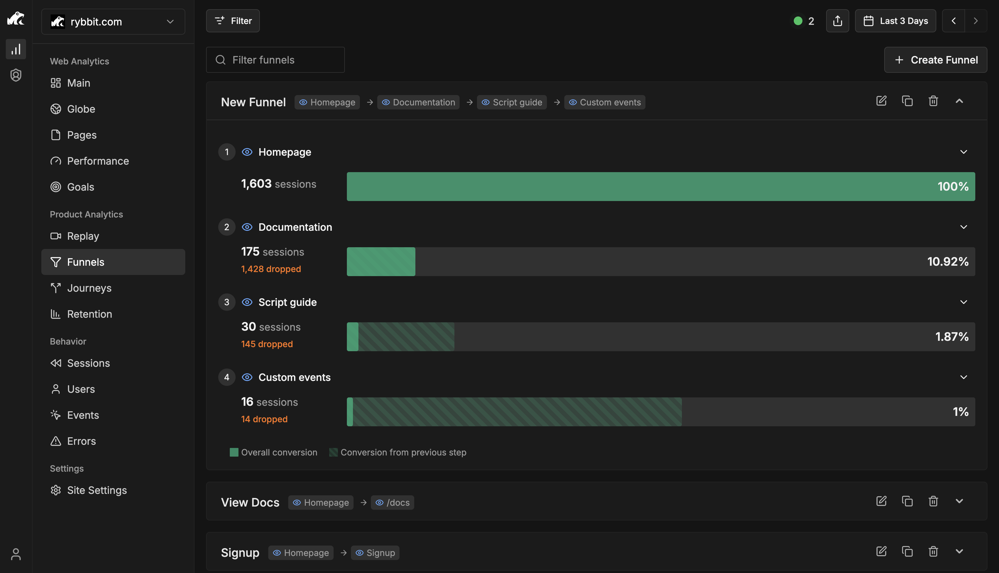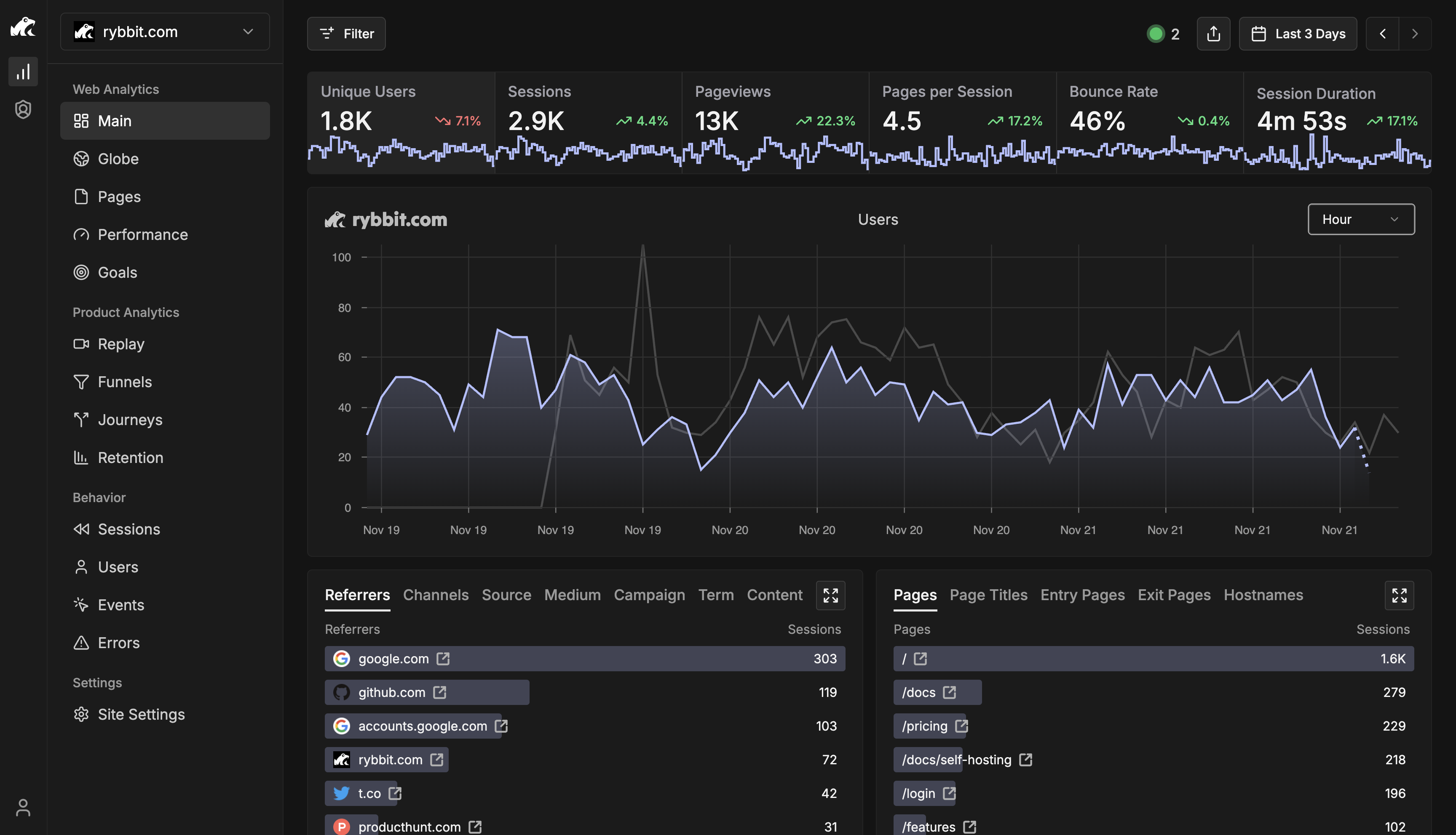 Rybbit definitely isn’t the first open source cookieless web analytics platform (Plausible and Umami are the two other big ones), but it’s probably the most “all-in-one” of all these alternatives.